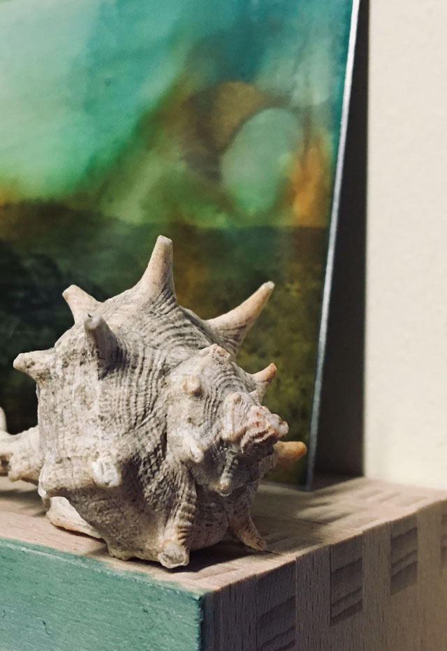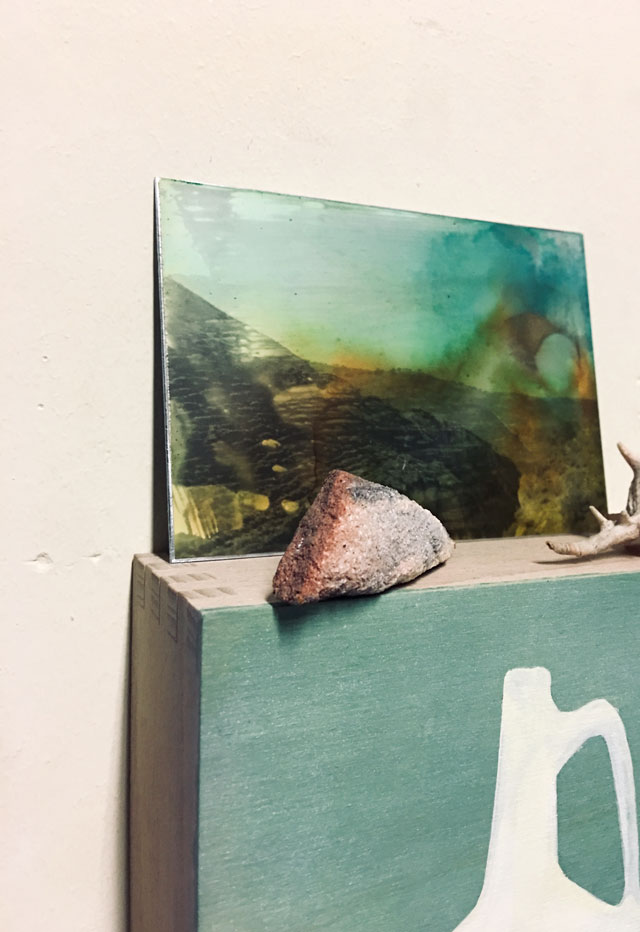 Peinture sur bois, coquillage et pierre, tirage analogue et rehaut encollé sur zinc, 15x24x6cm, 2018