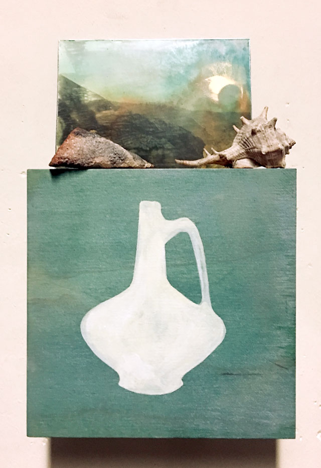 Painting on wood, shell and stone, colored analog print glued on zinc, 15x24x6cm, 2018
