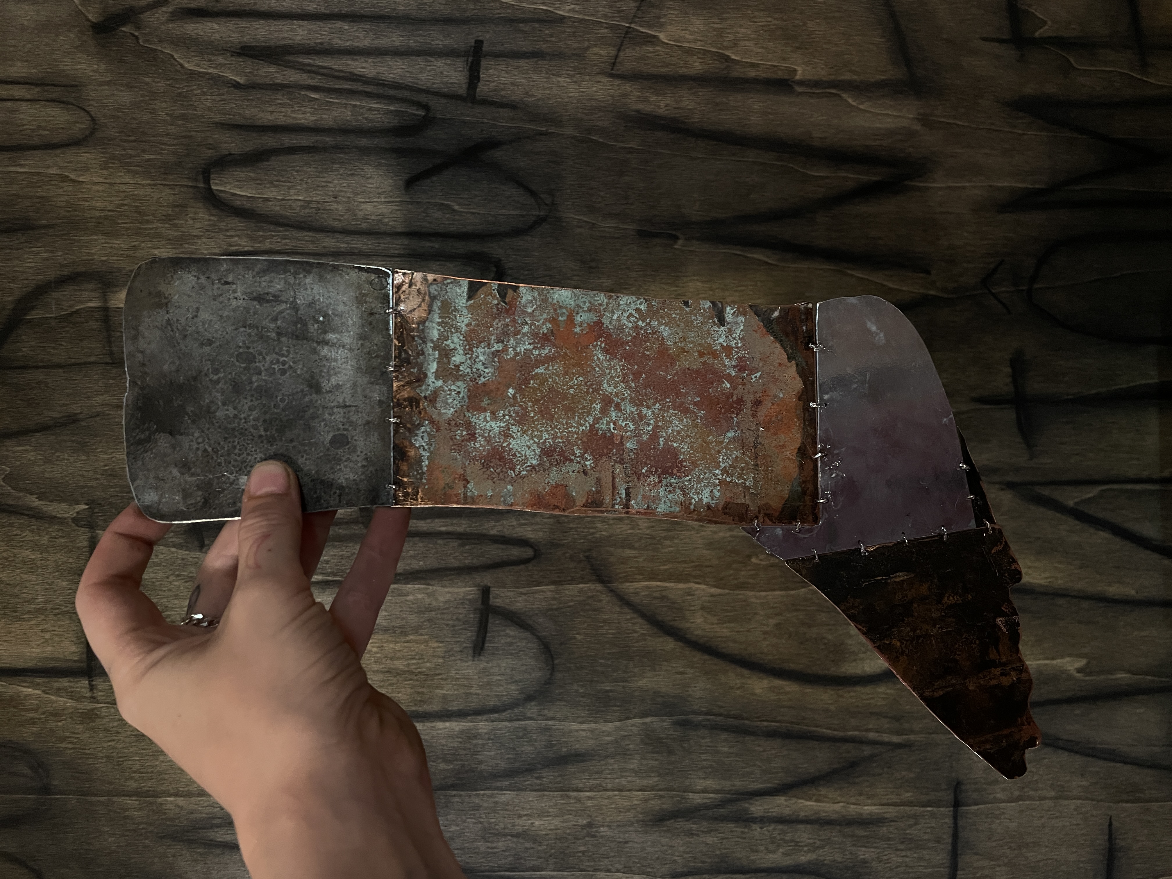 « Pro itu et reditus* » est un ensemble de quatre tableaux métalliques, suspendus. Ces tableaux sont façonnés comme des feuillets de pensées. Toujours vivants, jamais finis. Ils sont découpés dans du neuf, mais aussi rapiécés, par du vieux. Dessinés à l’acide, et prêt à recevoir les différents éléments du temps pour continuer à s’oxyder. Chaque tableau est un dossier où une histoire lui est confiée.